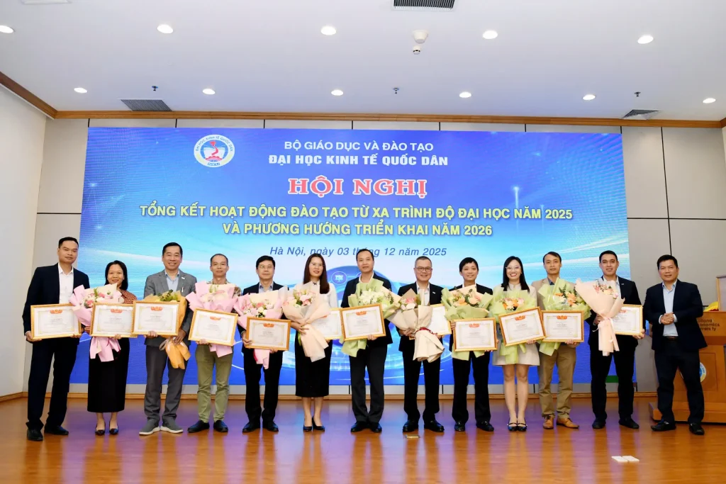Tại Hội nghị, lãnh đạo Đại học đã trao Giấy khen cho các tập thể và cá nhân có nhiều đóng góp tích cực trong công tác Đào tạo Từ xa năm 2025. Đây là sự ghi nhận xứng đáng dành cho những nỗ lực bền bỉ trong công tác quản lý, hỗ trợ người học, phát triển học liệu và triển khai các hoạt động chuyên môn. Những tập thể và cá nhân được biểu dương đã góp phần quan trọng vào sự phát triển của Trung tâm, tạo nên những dấu ấn nổi bật trong năm vừa qua và là động lực để Đại học Kinh tế Quốc dân tiếp tục đổi mới, nâng cao chất lượng trong giai đoạn tới.