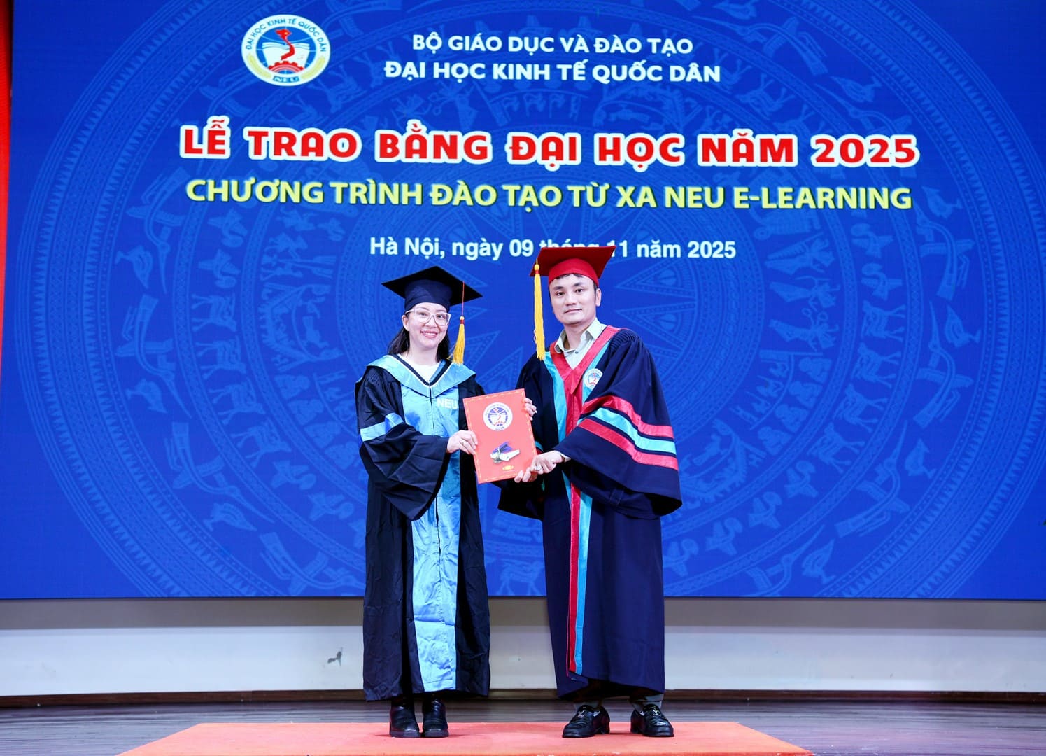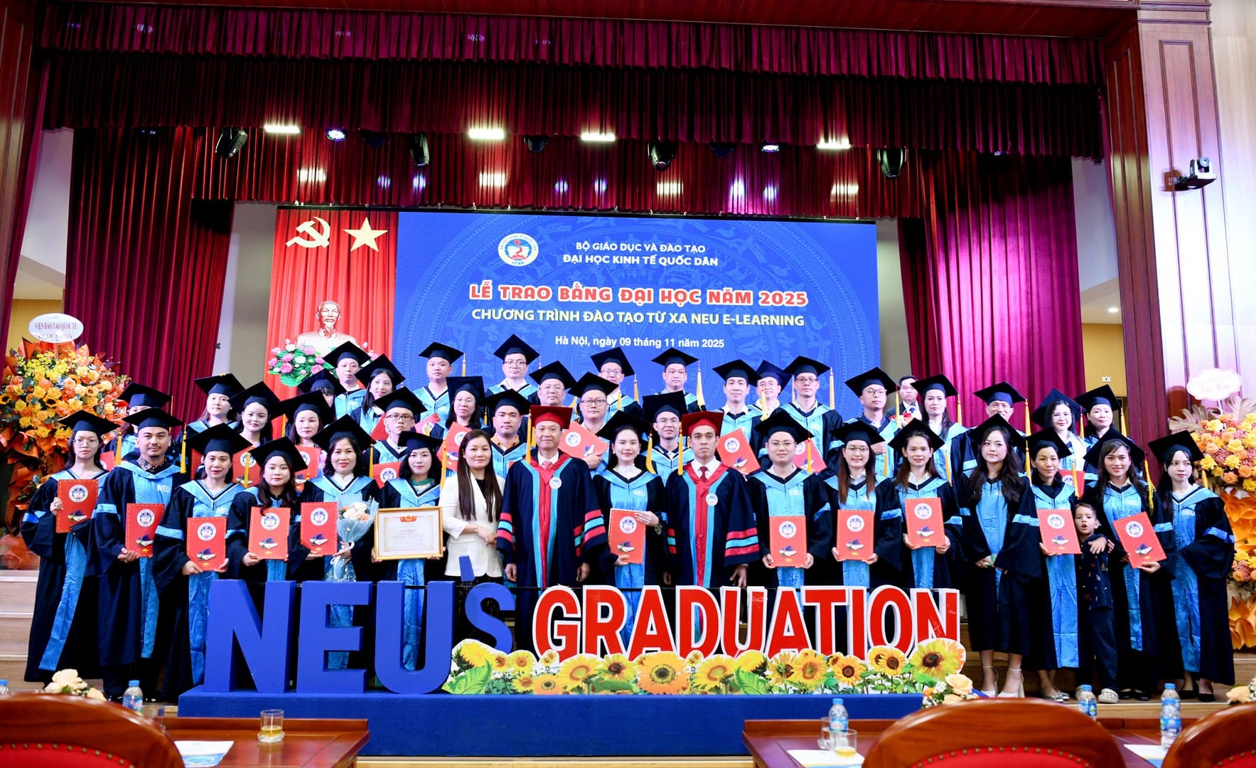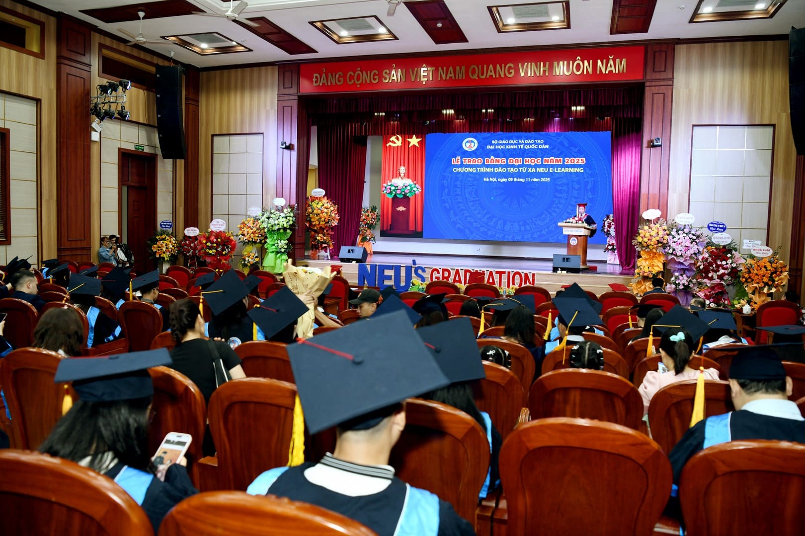 Tham dự buổi Lễ có: PGS.TS Bùi Huy Nhượng – Phó Giám đốc Đại học; PGS.TS Đàm Quang Vinh – Giám đốc Trung tâm Đào tạo Từ xa; cùng đại diện lãnh đạo các Trường, Phòng ban, Khoa, Viện, Trung tâm; các cán bộ quản lý của Trung tâm Đào tạo từ xa, các cán bộ quản lý của đơn vị đối tác phối hợp, các phòng ban liên quan và đặc biệt là sự có mặt của 200 tân cử nhân chương trình Đào tạo từ xa NEU E-Learning.