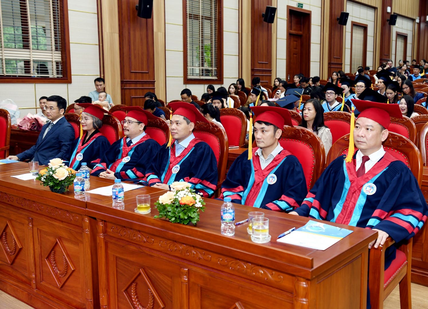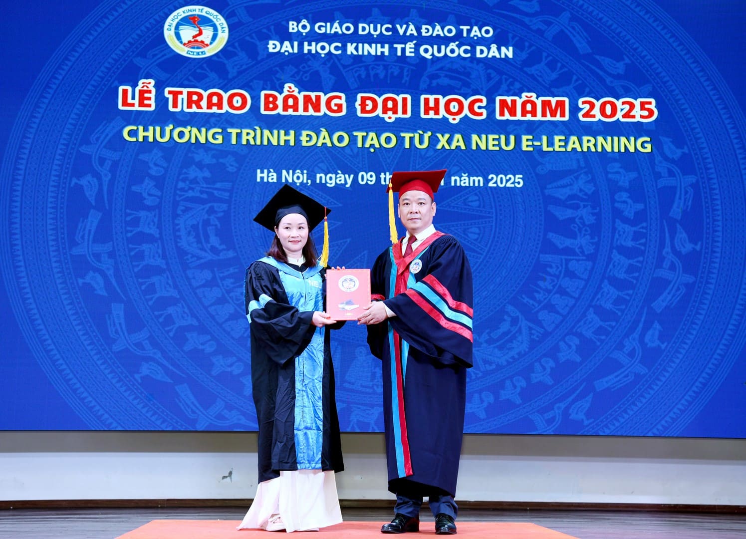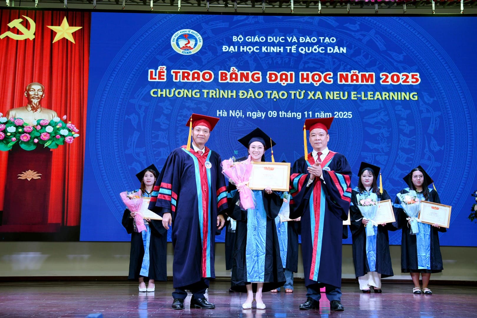 Tham dự buổi Lễ có: PGS.TS Bùi Huy Nhượng – Phó Giám đốc Đại học; PGS.TS Đàm Quang Vinh – Giám đốc Trung tâm Đào tạo Từ xa; cùng đại diện lãnh đạo các Trường, Phòng ban, Khoa, Viện, Trung tâm; các cán bộ quản lý của Trung tâm Đào tạo từ xa, các cán bộ quản lý của đơn vị đối tác phối hợp, các phòng ban liên quan và đặc biệt là sự có mặt của 200 tân cử nhân chương trình Đào tạo từ xa NEU E-Learning.