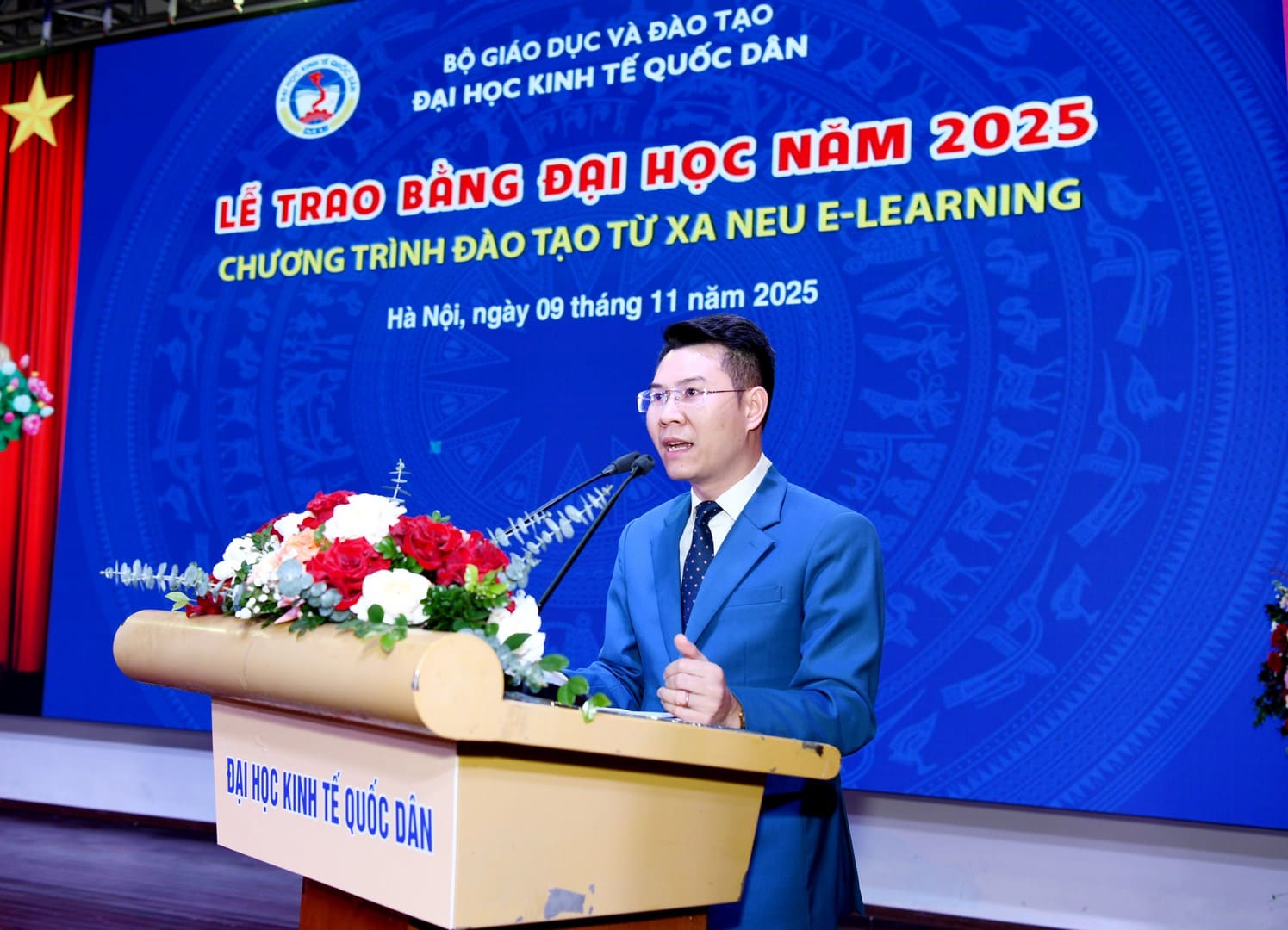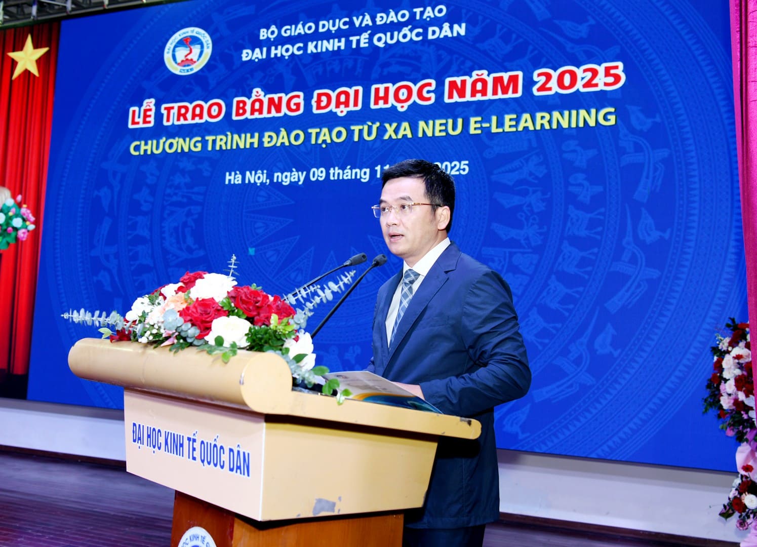 Phát biểu tại Lễ trao bằng Đại học Chương trình đào tạo từ xa NEU E-Learning, PGS.TS Bùi Huy Nhượng – Giám đốc Đại học Kinh tế Quốc dân gửi lời chúc mừng nồng nhiệt tới các tân cử nhân đã nỗ lực không ngừng trong suốt quá trình học tập, vượt qua nhiều khó khăn để hoàn thành xuất sắc chương trình và chính thức nhận tấm bằng danh giá của Đại học Kinh tế Quốc dân.