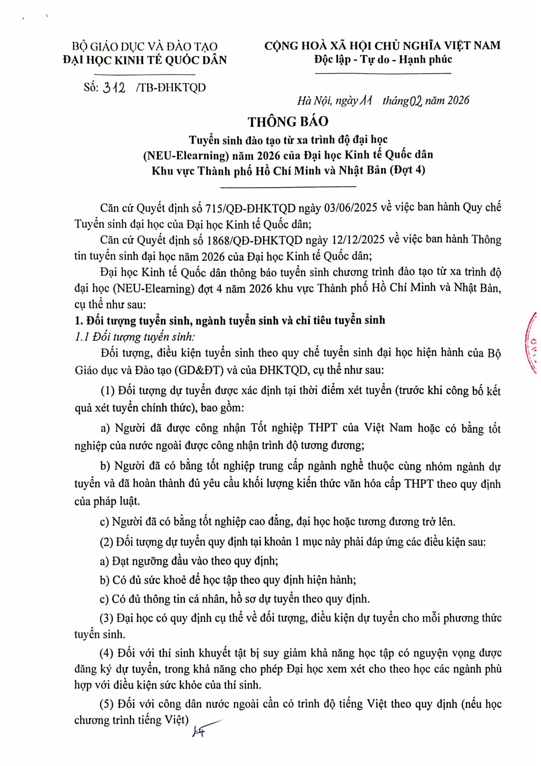 Đại học Kinh tế Quốc dân thông báo tuyển sinh chương trình đào tạo từ xa trình độ đại học (NEU-Elearning) đợt 4 năm 2026 khu vực Thành phố Hồ Chí Minh và Nhật Bản, cụ thể như sau: